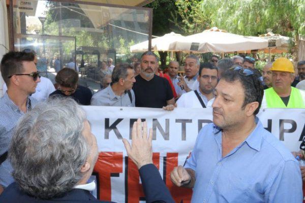Έξω από το Επιμελητήριο πραγματοποιήθηκε συγκέντρωση διαμαρτυρίας, την οποία οργάνωσαν το Εργατικό Κέντρο Ηρακλείου και άλλοι φορείς. Στην κινητοποίηση εκφράστηκε αντίθεση στο ασφαλιστικό και τέθηκε ως αίτημα η απόσυρση του. Ο υπουργός απάντησε στους συγκεντρωθέντες ότι το ασφαλιστικό έχει ψηφιστεί από τη Βουλή και είναι νόμος του κράτους.
