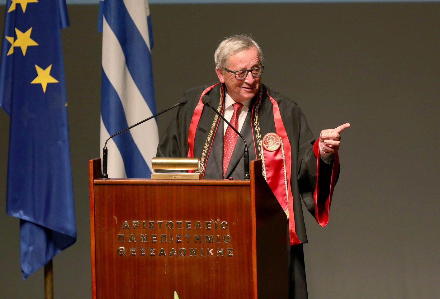 Κατά την τελετή, ο πρύτανης του ΑΠΘ, καθηγητής Περικλής Μήτκας, χαρακτήρισε τον κ. Γιούνκερ «εξέχοντα Ευρωπαίο φιλέλληνα».