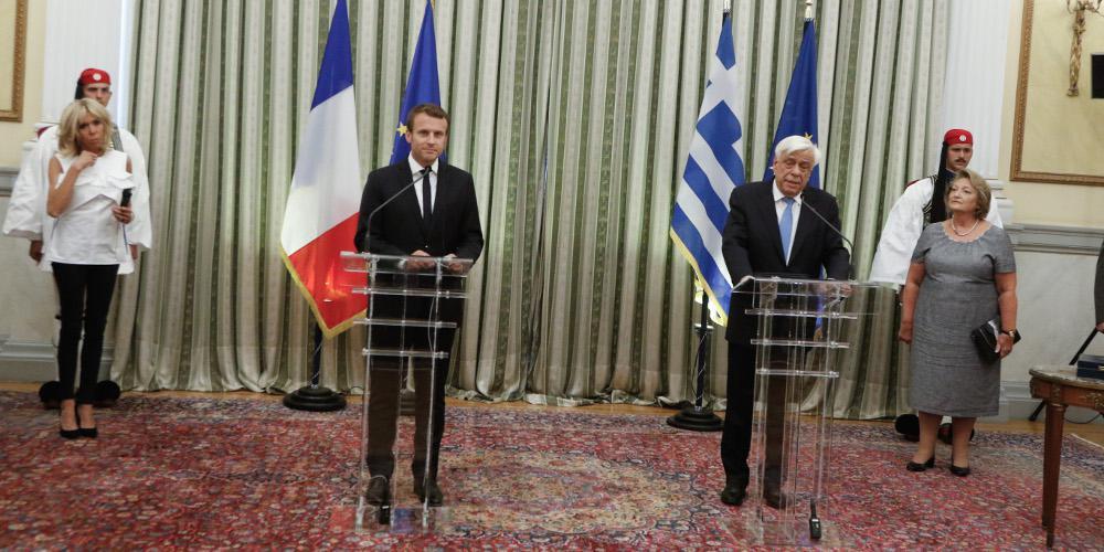 Εμανουέλ και Μπριζίτ Μακρόν έφθασαν στις 12:45 στην Αθήνα. Τον Γάλλο πρόεδρο υποδέχθηκαν στο αεροδρόμιο «Ελ. Βενιζέλος» ο υπουργός Επικρατείας και κυβερνητικός εκπρόσωπος Δημήτρης Τζανακόπουλος και ο Γάλλος πρεσβευτής στην Αθήνα, Κριστόφ Σαντεπί.