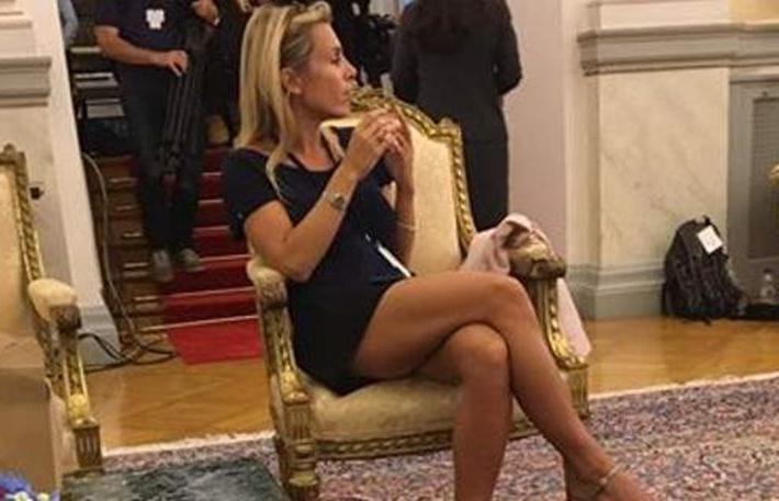 Στη φωτογραφία, που «ανέβασε» στον λογαριασμό του στο Facebook ο δημοσιογράφος Νίκος Χασαπόπουλος, η Γαλλίδα ρεπόρτερ απεικονίζεται να κάθεται σταυροπόδι, με τα καλλίγραμμα πόδια της να αναδεικνύονται, χάρη στο μίνι μαύρο φόρεμα που επέλεξε να φορέσει…
