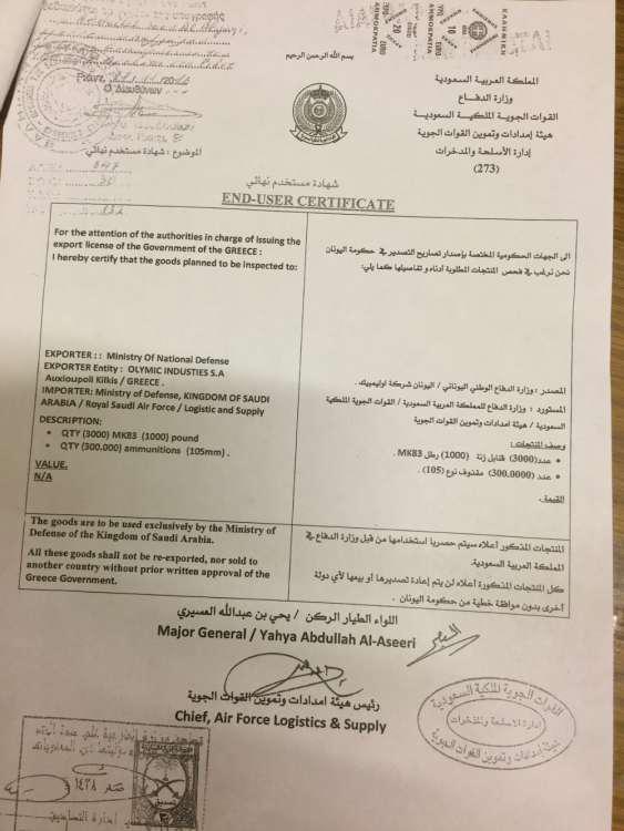 Όπως αναφέρουν από την αξιωματική αντιπολίτευση, σε ό,τι αφορά το «end user certificate» («πιστοποιητικό τελικού χρήστη»), αναγράφεται ο Yahya Abdullah Al Asseri, ως επικεφαλής της Διεύθυνσης εξοπλισμών της Σαουδικής Αραβίας, να υπογράφει για την αντισυμβαλλόμενη κυβέρνηση.