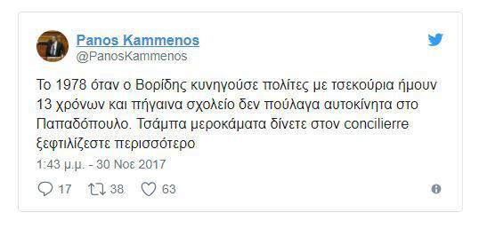 «Το 1978 όταν ο Βορίδης κυνηγούσε πολίτες με τσεκούρια ήμουν 13 χρόνων και πήγαινα σχολείο δεν πούλαγα αυτοκίνητα στο Παπαδόπουλο. Τσάμπα μεροκάματα δίνετε στον concilierre ξεφτιλίζεστε περισσότερο»