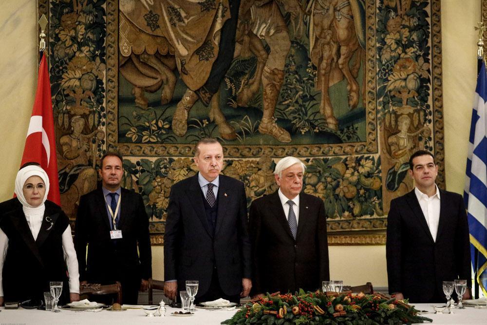 Με την ανάκρουση των εθνικών ύμων Ελλάδας και Τουρκίας ξεκίνησεστο Προεδρικό Μέγαρο το επίσημο δείπνο που παραθέτει ο Πρόεδροςτης Δημοκρατίας Προκόπης Παυλόπουλος στον Τούρκο ΠρόεδροΤαγίπ Ερντογάν.