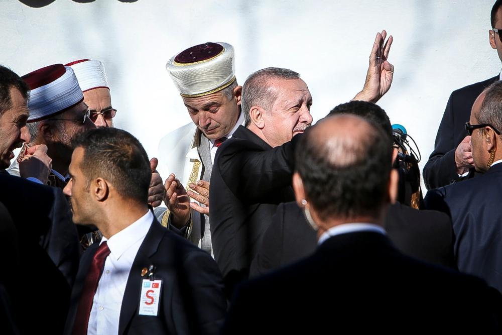 Ο Τούρκος πρόεδρος έφτασε λίγο μετά τις 12:20. Είχε κατεβάσει το παράθυρο του αυτοκινήτου του και χαιρετούσε τον κόσμο. Οπως αρμόζει η διαδικασία, εισήλθε στο χώρο από την πίσω πόρτα του τεμένους. Παιδιά του χάρισαν ανθοδέσμες, ενώ οι συγκεντρωμένοι άρχισαν να φωνάζουν ρυθμικά το όνομά του. Πριν μπει στο τζαμί, προσέγγισε για λίγο τους συγκεντρωμένους, ορισμένοι από τους οποίους φώναξαν «ηγέτη μας». Τα αστυνομικά μέτρα ήταν πρωτοφανή για την Κομοτηνή και όποιος έμπαινε στον αύλειο χώρο του τζαμιού ελέγχονταν εξονυχιστικά με μηχανήματα από άντρες της ΕΛ.ΑΣ., ενώ υπήρχαν και αστυνομικοί ακροβολισμένοι στις γειτονικές ταράτσες.