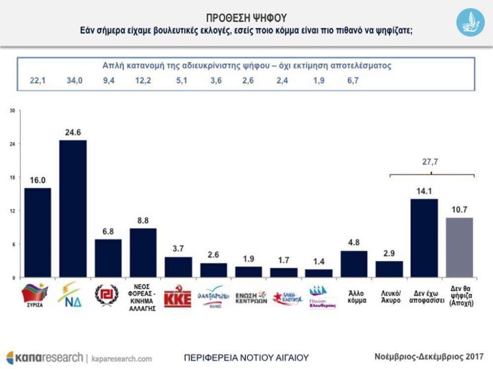 Από την απλή κατανομή της αδιευκρίνιστης ψήφου (όχι εκτίμηση αποτελέσματος) η Kαπα Research αποδίδει ποσοστό 34% στη Νέα Δημοκρατία και 22,1% στον ΣΥΡΙΖΑ.