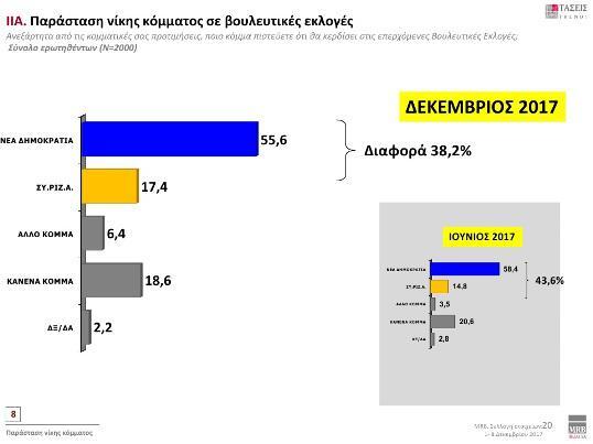 Στην παράσταση νίκης, η ΝΔ προηγείται με 55,6%, ενώ ο ΣΥΡΙΖΑ συγκεντρώνει 17,4%. Η επιλογή «Κανένα κόμμα» καταγράφει ποσοστό 18,6%. Ακολουθούν «Άλλο κόμμα» με 6,4% και «Δεν ξέρω/Δεν απαντώ» με ποσοστό 2,2%.