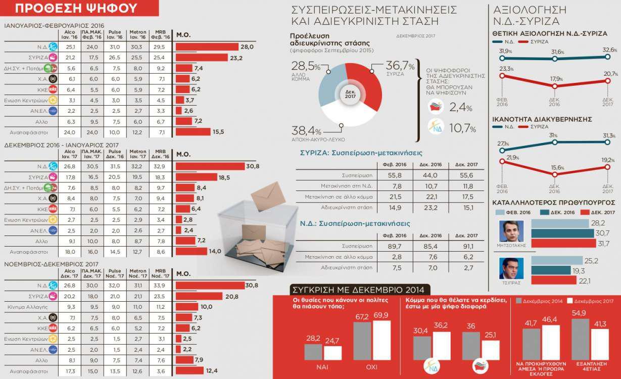 Αν οι δημοσκοπήσεις του 2016 έδειξαν μια σαφή υπεροχή της Ν.Δ. έναντι του ΣΥΡΙΖΑ και ουσιαστικά την πλήρη πολιτική ανατροπή σε σχέση με το 2015, το 2017 επιβεβαίωσε και σταθεροποίησε αυτά τα δεδομένα. Παρότι ο ΣΥΡΙΖΑ κινήθηκε ανοδικά στο δεύτερο μισό του έτους, δεν έκανε τίποτε άλλο παρά να καλύψει μέρος μόνο από τις απώλειές του στην πορεία των δύο τελευταίων χρόνων. Στις αρχές του 2016, μετά την εκλογή του Κυριάκου Μητσοτάκη, υστερούσε έναντι της Ν.Δ. κατά πέντε μονάδες, σύμφωνα με έναν ενδεικτικό μέσο όρο των στοιχείων που δημοσιεύονταν. Σήμερα η απόσταση είναι διπλάσια.