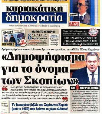 «Ο ελληνικός λαός θα πρέπει να αποφασίσει για την πρωτοφανή, στην ιστορία της ανθρωπότητας, εκχώρηση της ιστορίας και του πολιτισμού του σε άλλον λαό» αναφέρει ο πρόεδρος των Ανεξαρτήτων Ελλήνων και υπουργός Εθνικής Άμυνας σε άρθρο του που θα δημοσιευτεί στην «Δημοκρατία».