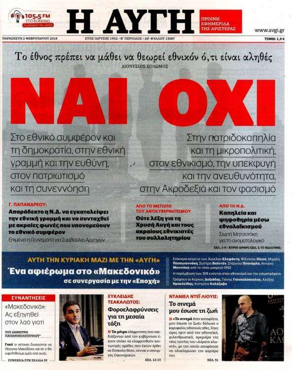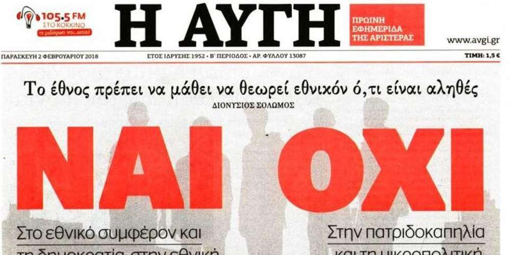 Η εφημερίδα στο πρωτοσέλιδο της έχει ένα μεγάλο «Ναι» στη αριστερή πλευρά και ένα μεγάλο «Οχι» στη δεξιά, θυμίζοντας τα ψηφοδέλτια του δημοψηφίσματος.