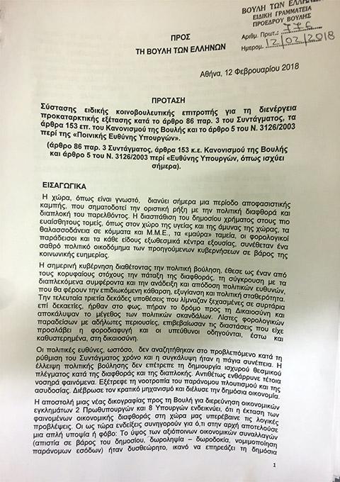 Η αίτηση του ΣΥΡΙΖΑ για σύσταση προανακριτικής επιτροπή κατατέθηκε μετά τη συνεδρίαση της Κοινοβουλευτικής Ομάδας του ΣΥΡΙΖΑ, όπου ο πρωθυπουργός Αλέξης Τσίπρας επισήμανε ότι όποιος μιλάει για παραγραφή των ενδεχόμενων ποινικών ευθυνών που έχουν οι εμπλεκόμενοι πολιτικοί είναι σαν να παραδέχονται την ενοχή τους.