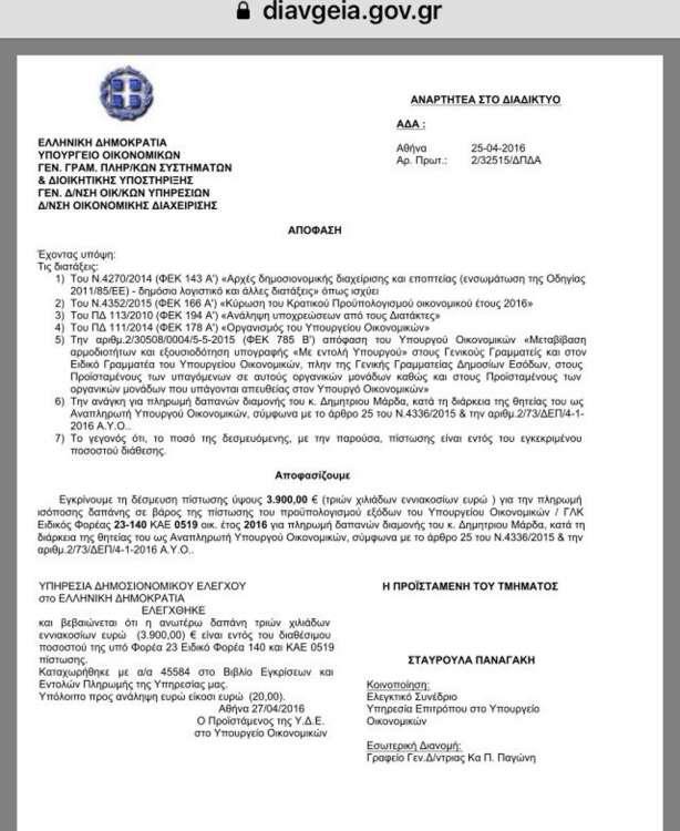 Ο Δημήτρης Μάρδας, ο οποίος είχε διατελέσει αναπληρωτής ΥΠΟΙΚ (Ιανουάριος 2015-Αύγουστος 2015) και υφυπουργός Εξωτερικών (Σεπτέμβριος 2015- Νοέμβριο 2016). ο κ.Μαρδας, στην πρώτη κυβέρνηση ΣΥΡΙΖΑ- ΑΝΕΛ, έκανε αίτηση και το έλαβε στις 25 Απριλίου 2016 και έτσι 8 μήνες αργότερα εγκρίθηκε η δαπάνη. Μάλιστα φέρεται να είναι και ένα από τα πρόσωπα πρωταγωνιστικό ρόλο στην επίμαχη διάταξη.