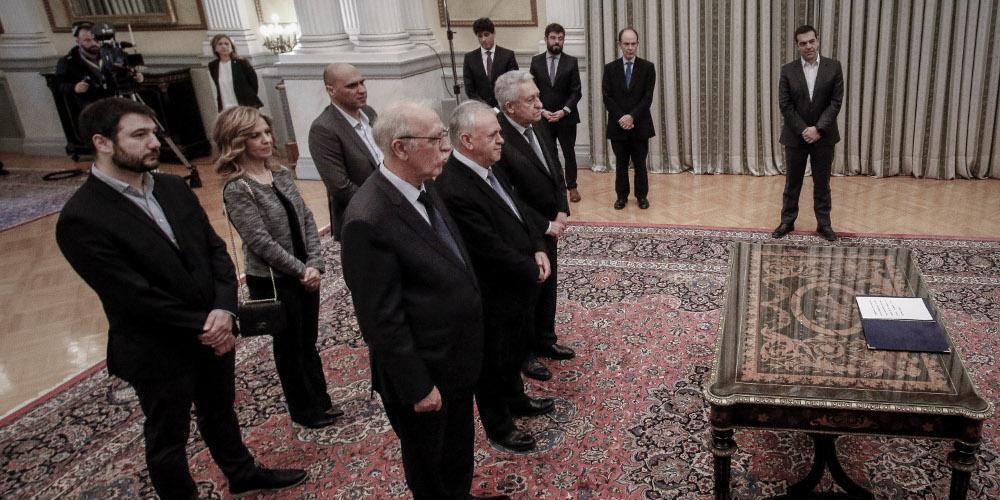 Οσοι περίμεναν να δουν και τον Αρχιεπίσκοπο Ιερώνυμο διαψεύστηκαν, καθώς άπαντες έδωσαν ένα σύντομο πολιτικό όρκο και στη συνέχεια υπέγραψαν τα σχετικά έγγραφα. Oι νέοι υπουργοί ορκίστηκαν με τη λέξη «δηλώνω» και όχι «ορκίζομαι». Αν και ήταν λίγοι, μόλις πέντε αυτοί που ορκίστηκαν δεν έλειψαν τα πηγαδάκια.