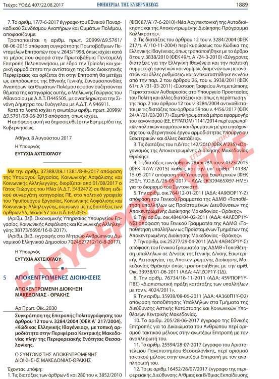 Τη θέση κατέχει η κ. Αικατερίνη Λιάκου στην οποία, σύμφωνα με το διατακτικό της απόφασης που υπογράφεται από την υπουργό Εργασίας, Εφη Αχτσιόγλου, και τον υφυπουργό, Τάσο Πετρόπουλο, «ανατίθενται από 01/09/2017 καθήκοντα μετακλητής υπαλλήλου στο πολιτικό γραφείο του υφυπουργού Κοινωνικής Ασφάλισης με παράλληλη άσκηση των κύριων καθηκόντων της ως προϊσταμένης στο Περιφερειακό Ελεγκτικό Κέντρο Ασφάλισης του Ενιαίου Φορέα Κοινωνικής Ασφάλισης (ΕΦΚΑ), σύμφωνα με τις διατάξεις των άρθρων 55, 556 και 57 του Προεδρικού Διατάγματος 63 του 2005».