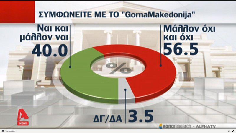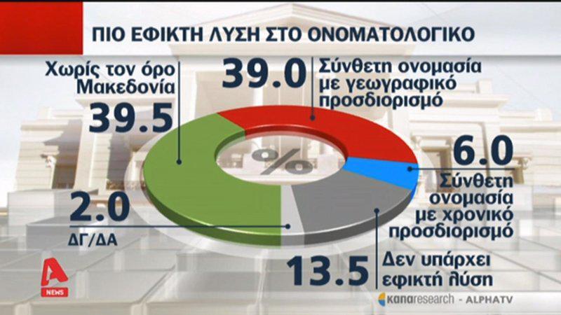 Ακόμη μεγαλύτερος διχασμός υπάρχει στο ζήτημα της ονομασίας, με το 44,9% να τάσσεται υπέρ μίας σύνθετης ονομασίας που θα περιλαμβάνει τον όρο «Μακεδονία», ενώ ένα 46,8% τάσσεται ξεκάθαρα κατά της σύνθετης ονομασίας.