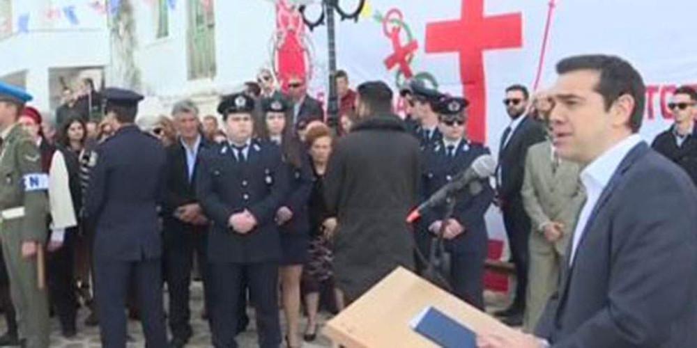Ειδικότερα, αμέσως μετά την επιμνημόσυνη δέηση και την κατάθεση στεφάνου στο Μνημείο Πεσόντων στην Πλατεία Ηρώων Ολοκαυτώματος, ο Αλέξης Τσίπρας εξέφρασε τη μεγάλη και ειλικρινή συγκίνηση του που τούτη την ιστορική μέρα βρέθηκε στον τιμημένο αυτόν τόπο από τις θυσίες των μαρτύρων και των αγωνιστών για να μπορούμε εμείς σήμερα να είμαστε ελεύθεροι, στα Ψαρά. Χαρακτήρισε το νησί «φάρο του ελληνισμού, μνημείο αυτοθυσίας, ηρωισμού αλλά και τόπο μαρτυρίου». Μιλώντας για την ιστορική επέτειο της 25ης Μαρτίου, σημείωσε ότι πέρασαν «197 χρόνια από τις μέρες που σήμαναν τον αγώνα για τη λευτεριά και την ανεξαρτησία για την πατρίδα μας», «τον αγώνα που ταυτόχρονα συμβόλισε τη δίψα ενός λαού για την απελευθέρωση από το ζυγό του κατακτητή και είχε μέσα του βαθιά χαραγμένες, αξίες και ιδανικά που αργότερα γέννησαν όλες τις μεγάλες αλλαγές που συγκλόνισαν τον κόσμο». Ο πρωθυπουργός μίλησε σε αυτό το πλαίσιο για αυτές τις παναθρώπινες αξίες που έφερε στο προσκήνιο ο διαφωτισμός: «Τις αξίες της ακλόνητης πίστης στην πρόοδο και την απόρριψη κάθε μορφής τυραννίας, σκλαβιάς και καταπίεσης. Ιδέες και αξίες, που άφησαν το στίγμα τους και κίνησαν τον τροχό της ιστορίας. Και που για χρόνια η ορμή τους, τροφοδότησε τη συλλογική πρόοδο των κοινωνιών και τους αγώνες των λαών για την πρόοδο».