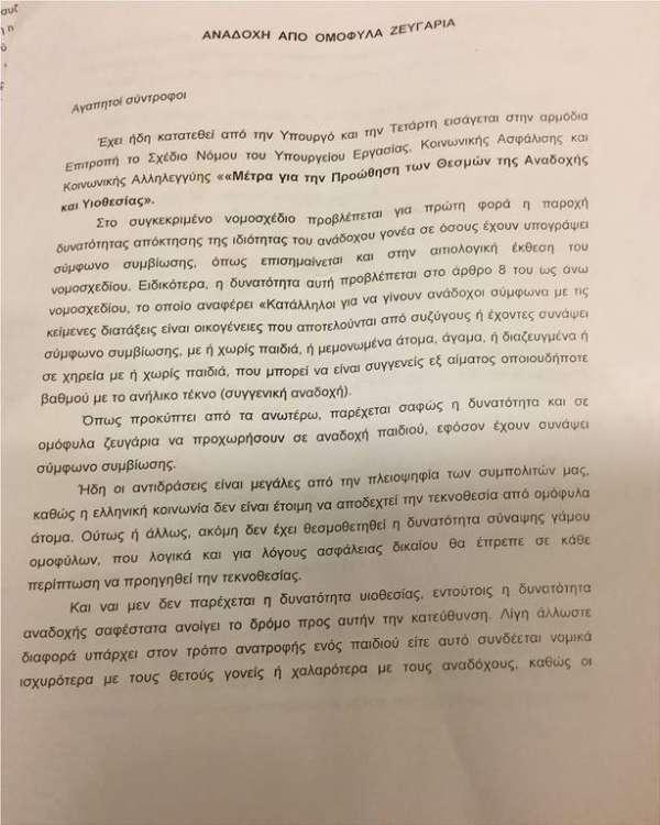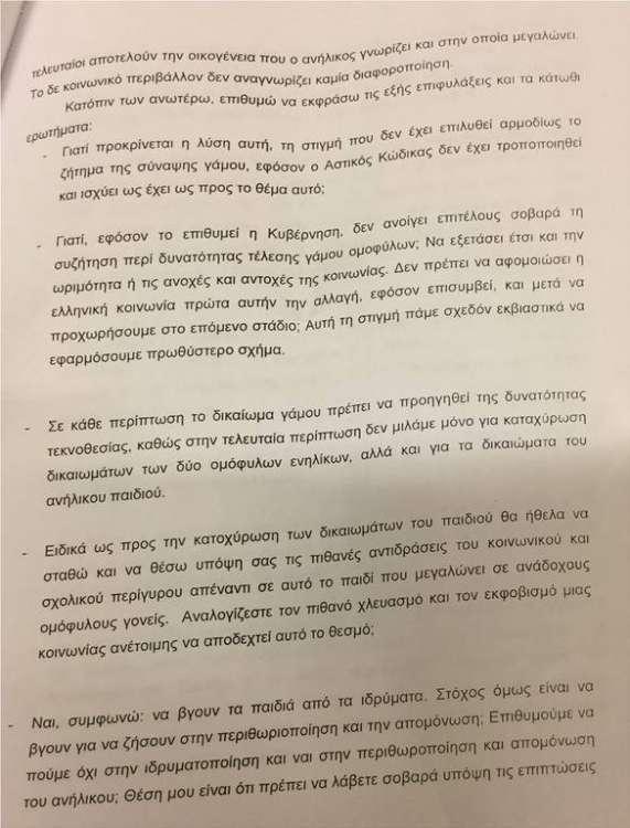 Στην επιστολή, μεταξύ άλλων, υποστηρίζουν ότι η κοινωνία είναι ανέτοιμη για υιοθεσία παιδιών από ομόφυλα ζευγάρια και διερωτούνται: «Η πραγματικότητα αποδεικνύει ότι η συντριπτική πλειοψηφία της κοινωνίας είναι αντίθετη. Γιατί επιδιώκουμε να πάμε κόντρα; Ειδικά αυτήν τη στιγμή;». Ταυτόχρονα, επικαλούνται «πιθανές αντιδράσεις του κοινωνικού και σχολικού περίγυρου απέναντι σε αυτό το παιδί που μεγαλώνει σε ανάδοχους ομόφυλους γονείς» αναφέροντας: «Αναλογίζεστε τον πιθανό χλευασμό και τον εκφοβισμό μιας κοινωνίας ανέτοιμης να αποδεχτεί αυτό το θεσμό; (…) Πρέπει να λάβετε σοβαρά υπόψη τις επιπτώσεις στον ψυχισμό του παιδιού αυτού. Διότι οι αρνητικές συνέπειες θα είναι τεράστιες, όχι επειδή τα ομόφυλα ζευγάρια είναι ακατάλληλα-κάθε άλλο, η ικανότητα ορίζεται και εξαρτάται από την ποιότητα του κάθε ατόμου, ξεκάθαρα- αλλά εξαιτίας της αντίδρασης του κοινωνικού και σχολικού περίγυρου».