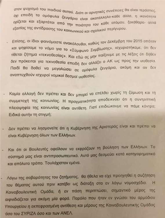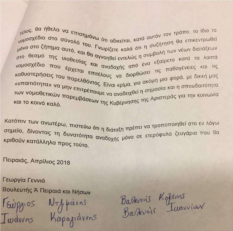 Μάλιστα δεν περιορίστηκαν μόνο σε προφορικές διαφωνίες, αλλά έστειλαν και επιστολή στις κυρίες Φωτίου και Αχτσιόγλου την οποία παρέδωσε η βουλευτής Πειραιά Γεωργία Γεννιά και την οποία υπογράφουν και οι βουλευτές Καραγιάννης και Ντζιμάνης. Από την πλευρά τους οι διαφωνούντες βουλευτές υποστηρίζουν πως η ελληνική κοινωνία δεν είναι ακόμα ώριμη για ένα τέτοιο βήμα, ενώ άλλοι επικαλέστηκαν και ιατρικούς όρους.