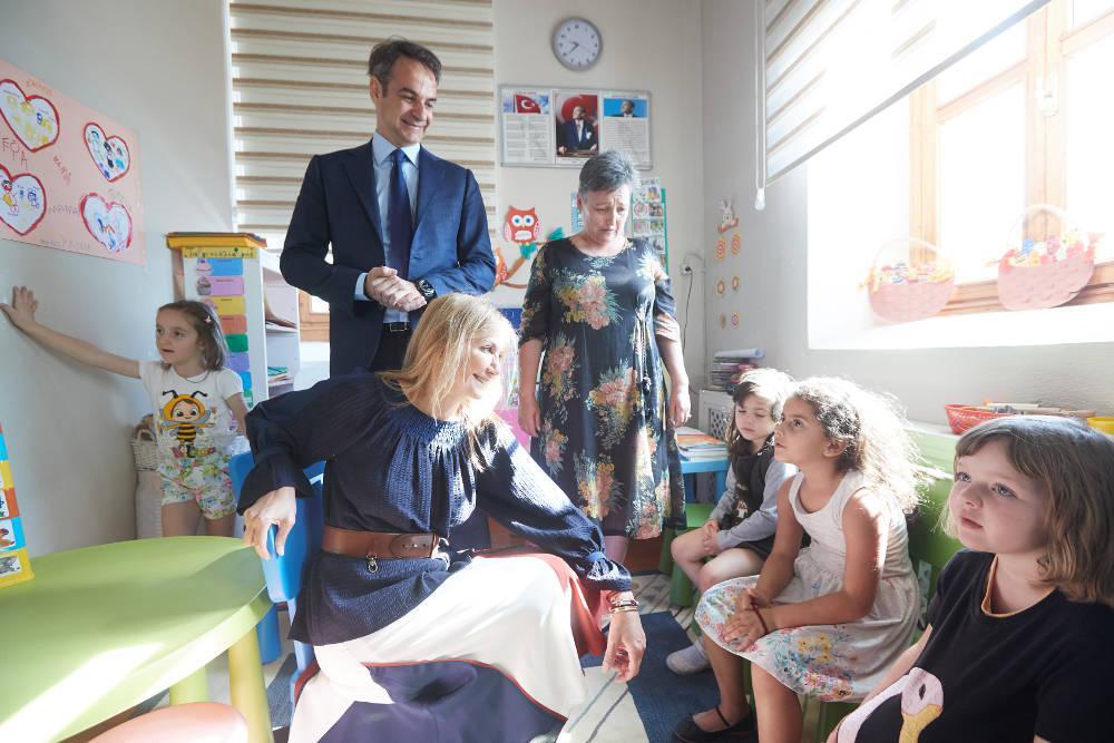 Ο κ. Μητσοτάκης, συνοδευόμενος από τη σύζυγό του, Μαρέβα, επισκέφθηκε το Νηπιαγωγείο και το Δημοτικό Σχολείο Αγίων Θεοδώρων, όπου οι μαθητές και μαθήτριες τους υποδέχθηκαν με παιδικά τραγούδια. Το δημοτικό σχολείο είχε κλείσει το 1964 με εντολή των τουρκικών αρχών, όμως επαναλειτούργησε με άδεια της κυβέρνησης Ερντογάν το 2013.