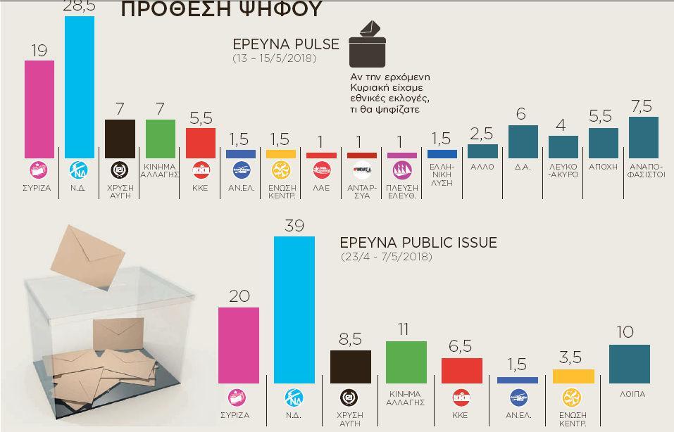 Στην έρευνα της Public Issue και στην εκτίμηση εκλογικής επιρροής για τον Μάιο του 2018, το προβάδισμα της αξιωματικής αντιπολίτευσης εκτοξεύεται στις 19 ποσοστιαίες μονάδες. Σε σύγκριση με τον πρώτο μήνα του τρέχοντος έτους, η εκλογική επιρροή της Ν.Δ. σημειώνει άνοδο δύο μονάδων και φθάνει στο 39%. Αντίθετα, η εκλογική επιρροή του ΣΥΡΙΖΑ υποχωρεί κατά μιάμιση μονάδα και υπολογίζεται στο 20%.