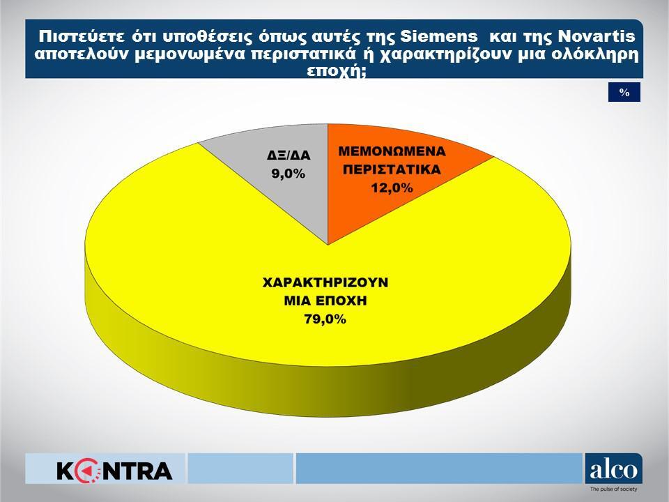 Μία εποχή με έντονη την οσμή σκανδάλων, φαίνεται πως έχει χαρακτηριστεί από τα αρνητικά πρωτοσέλιδα της περιόδου. Στην ερώτηση πιστεύετε ότι υποθέσεις όπως αυτές της Siemens και της Novartis αποτελούν μεμονωμένα περιστατικά ή χαρακτηρίζουν μία ολόκληρη εποχή, το 79% απάντησε ναι, με μόλις το 12% να βλέπει τις υποθέσεις ως μεμονωμένα περιστατικά και το 9% να επιλέξει το δεν ξέρω/ δεν απαντώ.