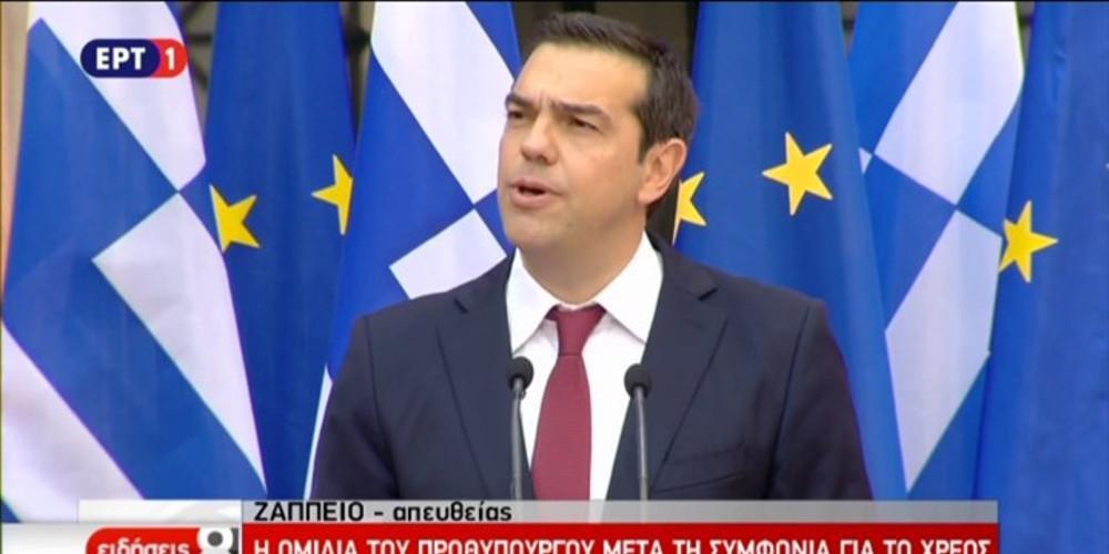 Ο πρωθυπουργός στην εκδήλωση στο Ζάππειο Μέγαρο για την ιστορική συμφωνία του Eurogroup για τη ρύθμιση του ελληνικού χρέους φόρεσε γραβάτα για πρώτη φορά, τηρώντας την υπόσχεσή του, με τα φλας των φωτογράφων να «παίρνουν φωτιά» για να απαθανατίσουν το στιγμιότυπο.