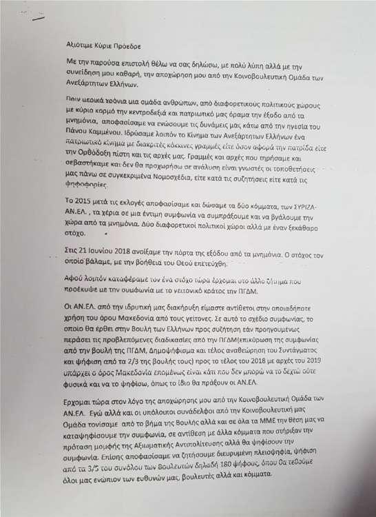 Στη συνέχεια της επιστολής του, ο ανεξάρτητος πλέον, βουλευτής υπερασπίζεται την ανάγκη για διευρυμένη πλειοψηφία στη συμφωνία με την π.Γ.Δ.Μ. και αναφέρει επί της ουσίας: «Όταν κατατέθη η πρόταση μομφής, σε λάθος χρόνο κατά την άποψή μου, (…) είχα να επιλέξω ανάμεσα σε δύο πράγματα: