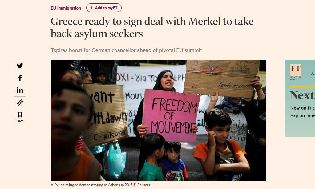 Όπως αναφέρει χαρακτηριστικά η βρετανική εφημερίδα, «ο πρωθυπουργός της Ελλάδας είναι έτοιμος να προχωρήσει σε συμφωνία με την Άνγκελα Μέρκελ προκειμένου να διευκολύνει τη Γερμανία να επιστρέψει αιτούντες άσυλο σε άλλες ευρωπαϊκές χώρες, δίνοντας έτσι στην καγκελάριο μια σημαντική ώθηση πριν από μια κρίσιμη Σύνοδο Κορυφής».