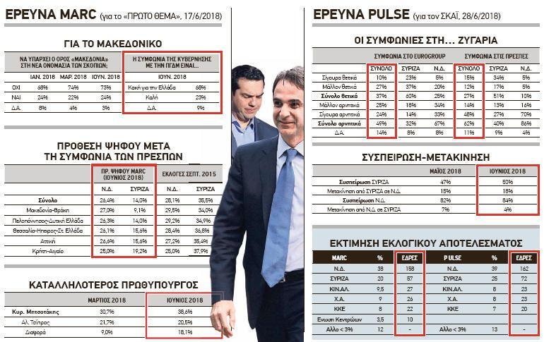 Η επόμενη Βουλή εμφανίζεται πεντακομματική, με τη Νέα Δημοκρατία να «χτυπά» από 158 έως 162 έδρες, σύμφωνα με τον εκλογικό αναλυτή Πάνο Σταθόπουλο. Η συμφωνία των Πρεσπών εξελίχθηκε σε κόλαφο για τον ΣΥΡΙΖΑ αλλά και για τους ΑΝ.ΕΛ. που εξαφανίστηκαν από το δημοσκοπικό χάρτη, τουλάχιστον σήμερα, ενώ εντυπωσιακή είναι η μετακίνηση του ψηφοφόρων του Αλέξη Τσίπρα προς το κόμμα του Κυριάκου Μητσοτάκη.