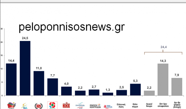 Όπως αναφέρεται στην έρευνα που δημοσιοποιήθηκε από το peloponnisonews.gr η ΝΔ έχει προβάδισμα 10 μονάδων και ακολουθεί ο ΣΥΡΙΖΑ με αισθητή διαφορά, ενώ πολύ κοντά στον κυβερνών κόμμα βρίσκεται η Χρυσή Αυγή με 11% και ακολουθεί το Κίνημα Αλλαγής με 7,7%.