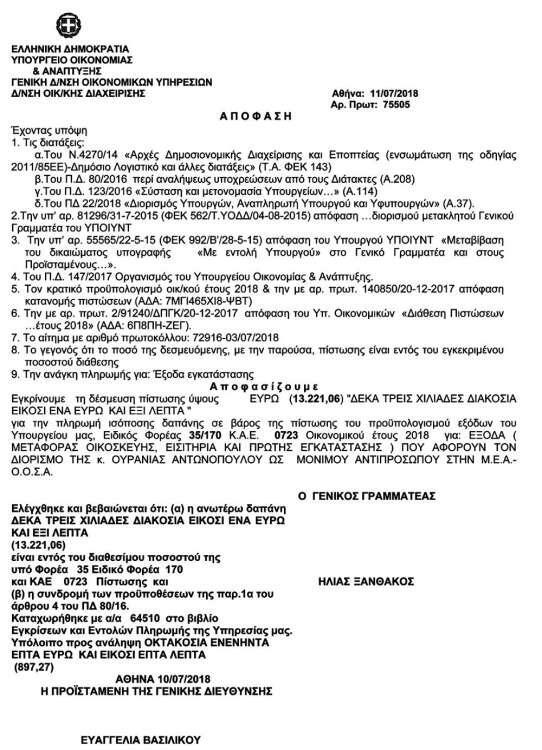 Η ανάρτηση στη Διαύγεια της απόφασης του υπουργείου Οικονομίας και Ανάπτυξης (με χθεσινή ημερομηνία 11/7/2018), με την οποία εγκρίνεται η δέσμευση ποσού 13.221,06 ευρώ για να καλυφθούν τα έξοδα μεταφοράς οικοσκευής, εισιτήρια και πρώτης εγκατάστασης που αφορούν το διορισμό της κ. Αντωνοπούλου ως Μονίμου Αντιπροσώπου στην ΜΕΑ (Μόνιμη Ελληνική Αντιπροσωπία) ΟΟΣΑ, προκαλεί σφοδρές πολιτικές και κοινωνικές αντιδράσεις. Και αυτό διότι πολλοί την ερμηνεύουν ως μια κίνηση «αποκατάστασης» της τέως υπουργού.