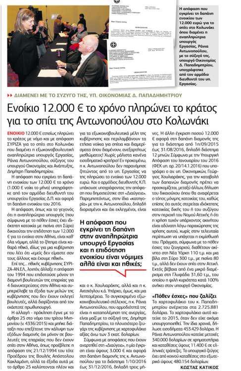 Ηταν Φεβρουάριος του 2018 όταν ο Ελεύθερος Τύπος αποκάλυπτε ότι η τότε αν. υπ. Εργασίας Ρ. Αντωνοπούλου είχε αιτηθεί και λάμβανε επιδότηση ενοικίου για το σπίτι στο Κολωνάκι που νοίκιαζε μαζί με το σύζυγό της και τότε υπ. Οικονομίας και Ανάπτυξης Δ. Παπαδημητρίου.