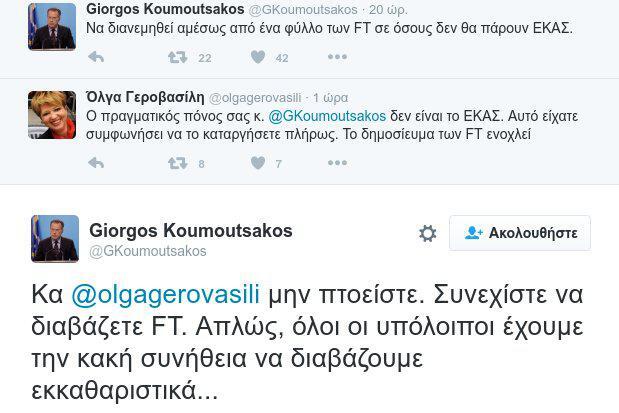 «Να διανεμηθεί αμέσως από ένα φύλλο των FT σε όσους δεν θα πάρουν ΕΚΑΣ», σχολίασε ο Γιώργος Κουμουτσάκος μέσω Twitter σχετικά με το δημοσίευμα της εφημερίδας.