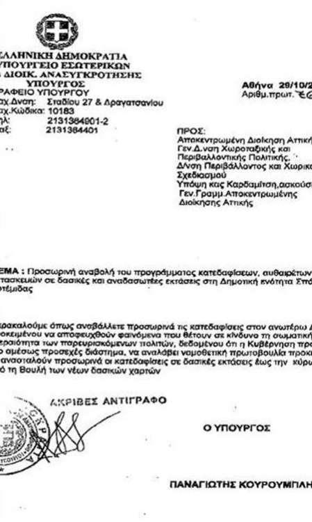 «Ακόμη στις 29/10/2015 ο επόμενος Υπουργός Εσωτερικών και Διοικητικής Ανασυγκρότησης ζητά την προσωρινή αναβολή όλου του προγράμματος κατεδαφίσεων αυθαιρέτων κατασκευών σε δασικές και αναδασωτέες εκτάσεις στην Δημοτική ενότητα Σπάτων Αρτέμιδας».