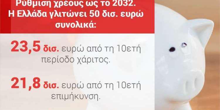 «Ρύθμιση χρέους ως το 2032. Η Ελλάδα γλυτώνει 50 δισ. ευρώ συνολικά: 23,5 δισ. ευρώ από τη 10ετή περίοδο χάριτος, 21,8 δισ. από τη 10ετή επιμήκυνση, 4,8 δισ. από την επιστροφή των κερδών των κεντρικών τραπεζών».