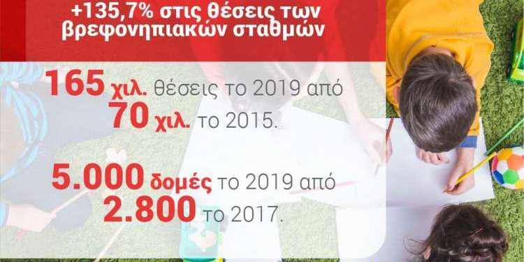 Αύξηση 135,7% στις θέσεις των βρεφονηπιακών σταθμών: 165 χιλ. θέσεις το 2019 από 70 χιλ. το 2015. 5.000 δομές το 2019 από 2.800 το 2017.