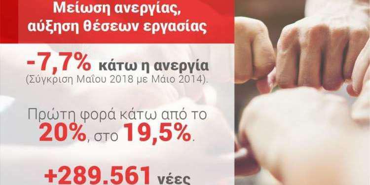 Μείωση ανεργίας, αύξηση θέσεων εργασίας: Μείωση 7,7% η ανεργία (Σύγκριση Μάιος 2014 – Μάιος 2018). Πρώτη φορά κάτω από 20%, στο 19,5%. Επιπλέον 289.561 νέες θέσεις εργασίας στον ιδιωτικό τομέα (Ιανουάριος-Ιούλιος 2018).