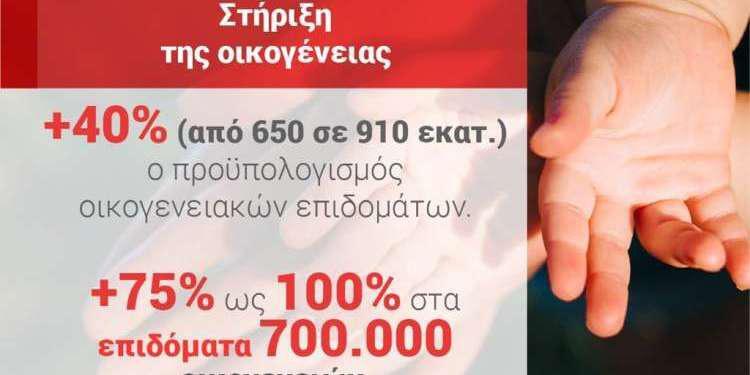 Στήριξη της οικογένειας: Αύξηση 40% (από 650 σε 910 εκατ.), ο προϋπολογισμός των οικογενειακών επιδομάτων. Αύξηση 75% ως 100% στα επιδόματα 700.000 οικογενειών. ΚΕΑ: 760 εκατ. ευρώ για 610.000 δικαιούχους.