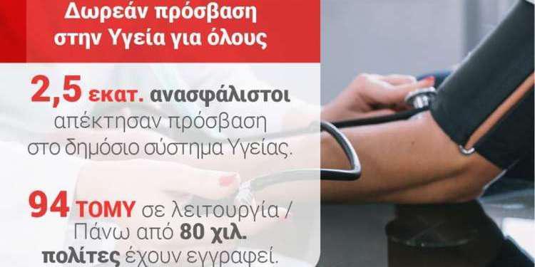 Δωρεάν πρόσβαση στην Υγεία για όλους: 2,5 εκατ. ανασφάλιστοι απέκτησαν πρόσβαση στο Δημόσιο Σύστημα Υγείας. 94 ΤΟΜΥ σε λειτουργία/ Πάνω από 80 χιλ. πολίτες έχουν εγγραφεί.