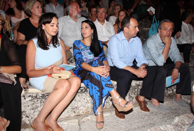 Ο πρώην πρωθυπουργός και η σύζυγός του Γεωργία Σαμαρά και ο βουλευτής της Νέας Δημοκρατίας Ιωάννης Πλακιωτάκης με την γυναίκα του, Αφροδίτη Δωρίτη, έδειχναν να απολαμβάνουν την παράσταση και την κουβέντα με τον κόσμο.