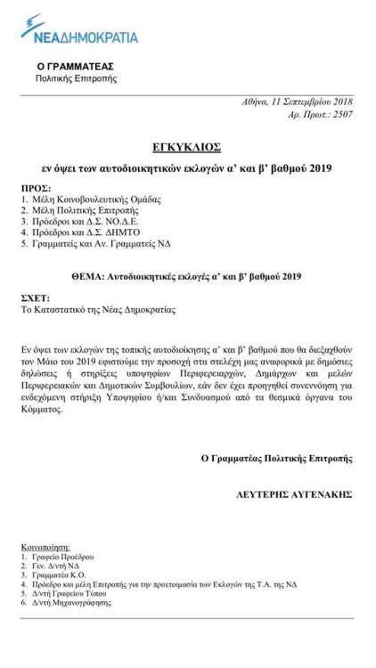 «Εν όψει των εκλογών της τοπικής αυτοδιοίκησης α’ και β’ βαθμού που θα διεξαχθούν τον Μάιο του 2019 εφιστούμε την προσοχή στα στελέχη μας αναφορικά με δημόσιες δηλώσεις ή στηρίξεις υποψηφίων Περιφερειαρχών, Δημάρχων και μελών Περιφερειακών και Δημοτικών Συμβουλίων, εάν δεν έχει προηγηθεί συνεννόηση για ενδεχόμενη στήριξη Υποψηφίου ή/και Συνδυασμού από τα θεσμικά όργανα του Κόμματος».