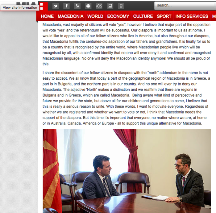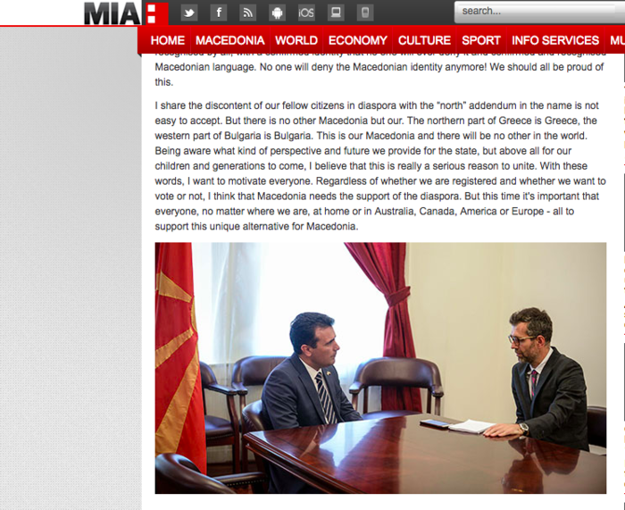 «Κατανοώ τη δυσαρέσκεια των συμπολιτών μας στη διασπορά για την προσθήκη “βόρεια” στο όνομα, δεν είναι εύκολο να το δεχθεί κανείς. Αλλά δεν υπάρχει άλλη Μακεδονία εκτός απο τη δική μας. Το βόρειο τμήμα της Ελλάδας είναι Ελλάδα, το δυτικό τμήμα της Βουλγαρίας είναι Βουλγαρία. Αυτή είναι η Μακεδονία μας και δεν θα υπάρχει άλλη στον κόσμο. Το να αντιλαμβάνεται κανείς τι είδους προοπτικές και τι είδους μέλλον παρέχουμε για το κράτος, αλλά πάνω από όλα για τα παιδιά και τις γενιές που θα έλθουν, πιστεύω ότι αυτός είναι ένας σοβαρός λόγος για να ενωθούμε. Με αυτά τα λόγια θέλω να κινητοποιήσω τους πάντες. Ανεξάρτητα από το εάν είναι εγγεγραμένοι ή αν θέλουν ή όχι να ψηφίσουν πιστεύω ότι η “Μακεδονία” χρειάζεται τη στήριξη της διασποράς. Αλλά αυτή τη φορά είναι σημαντικό για όλους, ανεξάρτητα που βρίσκονται, στην πατρίδα ή στην Αυστραλία, τον Καναδά, την Αμερική ή την Ευρώπη, όλοι να υποστηρίξουν αυτήν την μοναδική εναλλακτική για την “Μακεδονία”».