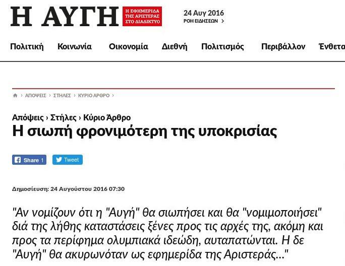 Αν νομίζουν ότι η «Αυγή» θα σιωπήσει και θα «νομιμοποιήσει» διά της λήθης καταστάσεις ξένες προς τις αρχές της, ακόμη και προς τα περίφημα ολυμπιακά ιδεώδη, αυταπατώνται. Η δε «Αυγή» θα ακυρωνόταν ως εφημερίδα της Αριστεράς.