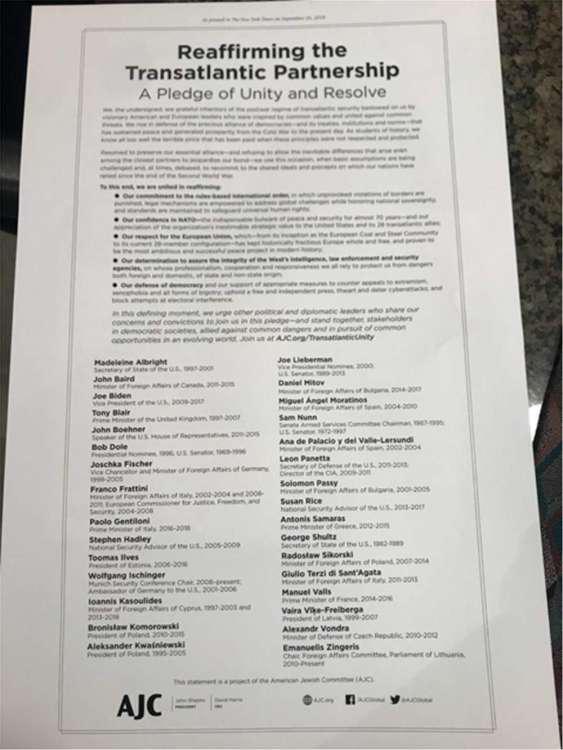 Η εν λόγω διακήρυξη της διατλαντικής συμμαχίας φιλοξενείται στη διάσημη «σελίδα 7» της εφημερίδας New York Times, υπογράφεται από σημαντικές προσωπικότητες του Δυτικού Κόσμου όπως ο Τόνι Μπλερ, ο αντιπρόεδρος των ΗΠΑ Τζο Μπαίντεν, ο πρ. Πρωθυπουργός της Ελλάδας Αντώνης Σαμαράς, ο πρ. αντικαγγελάριος της Γερμανίας Γιόσκα Φίσερ, ο πρ. Γάλλος Πρωθυπουργός Μανουέλ Βαλς, ο πρ. Πρωθυπουργός της Ιταλίας Τζεντιλόνι, οι πρ. Πρόεδροι Λιθουανίας, Πολωνίας, και Εσθονίας, πολλοί πρώην ΥπΕξ όπως η Μαντλέν Ολμπράιτ, ο Τζορτζ Σουλτζ, Ο Φραττίνι κ.α. αλλά και πρώην Προεδρικοί υποψήφιοι στις ΗΠΑ όπως ο Μπομπ Ντόουλ.