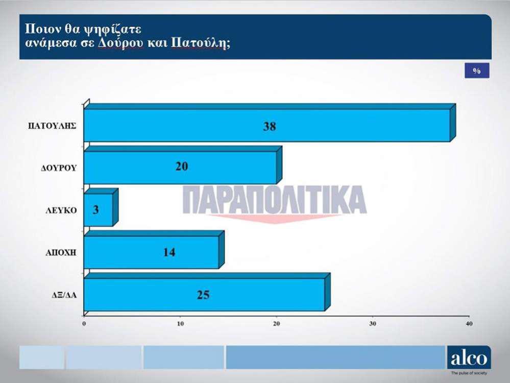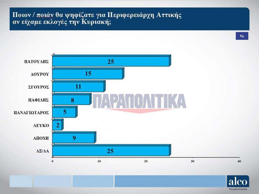 Στη μέτρηση της ALCO, στην πρόθεση ψήφου ο Γιώργος Πατούλης συγκεντρώνει ποσοστό 25% έναντι 15% της Ρένας Δούρου και 11% του Γιάννη Σγουρού.