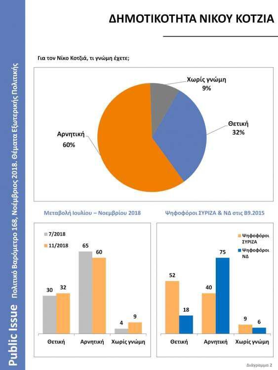 Αναφορικά με τη δημοτικότητα του κ. Κοτζιά, αυτά εμφανίζεται αρνητική κατά 60% και θετική κατά 32%.