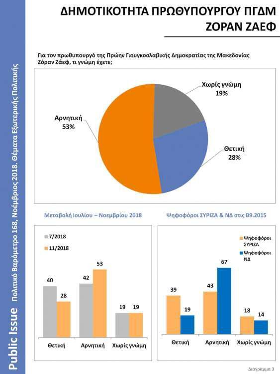 Όσον αφορά τη δημοτικότητα του πρωθυπουργού της πΓΔΜ, 53% των ερωτηθέντων απαντά ότι έχει αρνητική γνώμη, ενώ το 28% δηλώνει ότι έχει θετική γνώμη.