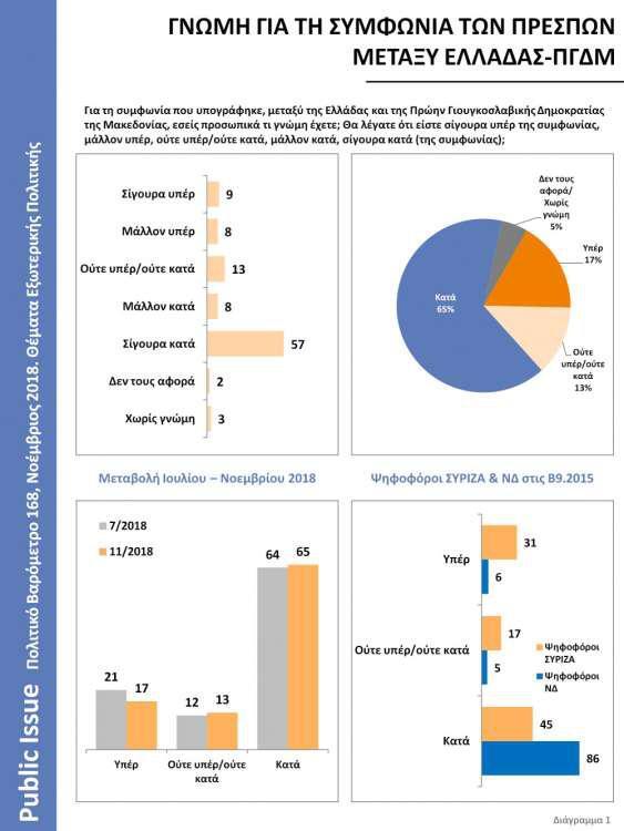 Οπως αποδεικνύεται οι πολίτες είναι εξαιρετικά αρνητικοί στην συμφωνία των Πρεσπών σε ποσοστό της τάξης του 65% έναντι μόλις 17% που τάσσεται υπέρ. Ενα 5% αναφέρει ότι δεν τον αφορά, ενώ ένα 13% δεν δηλώνει ούτε υπέρ, ούτε κατά.