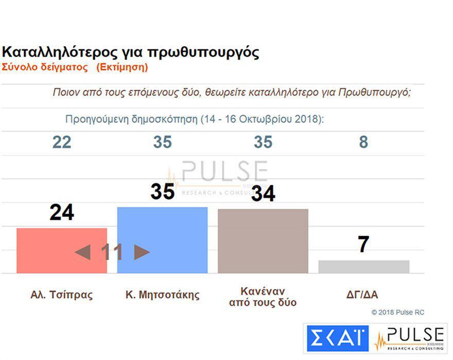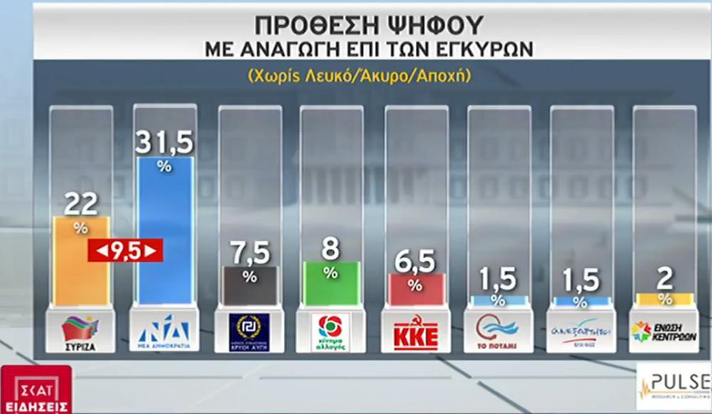 Ειδικότερα, σε δημοσκόπηση της εταιρείας «Pulse» για τον «ΣΚΑΪ» πρώτο κόμμα με είναι η Νέα Δημοκρατία με ποσοστό 31,5% ενώ ακολουθεί ο ΣΥΡΙΖΑ με 22%.