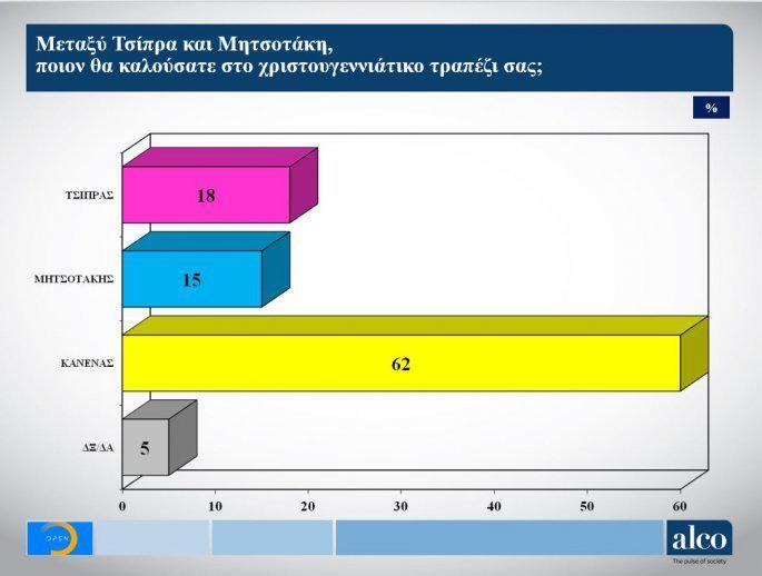 Μεταξύ Τσίπρα και Μητσοτάκη ποιον θα καλούσατε στο χριστουγεννιάτικο τραπέζι σας; Το 18% των συμμετεχόντων στη δημοσκόπηση απάντησε τον Αλέξη Τσίπρα, το 15% τον Κυριάκο Μητσοτάκη και το 62% κανέναν.