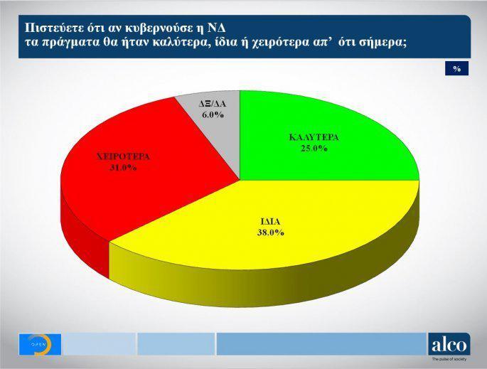 Αν κυβερνούσε η ΝΔ, θα ήταν καλύτερα ή χειρότερα από τώρα; Το 38% θεωρεί πως θα ήταν ίδια, καλύτερα το 25% και χειρότερα το 31%.
